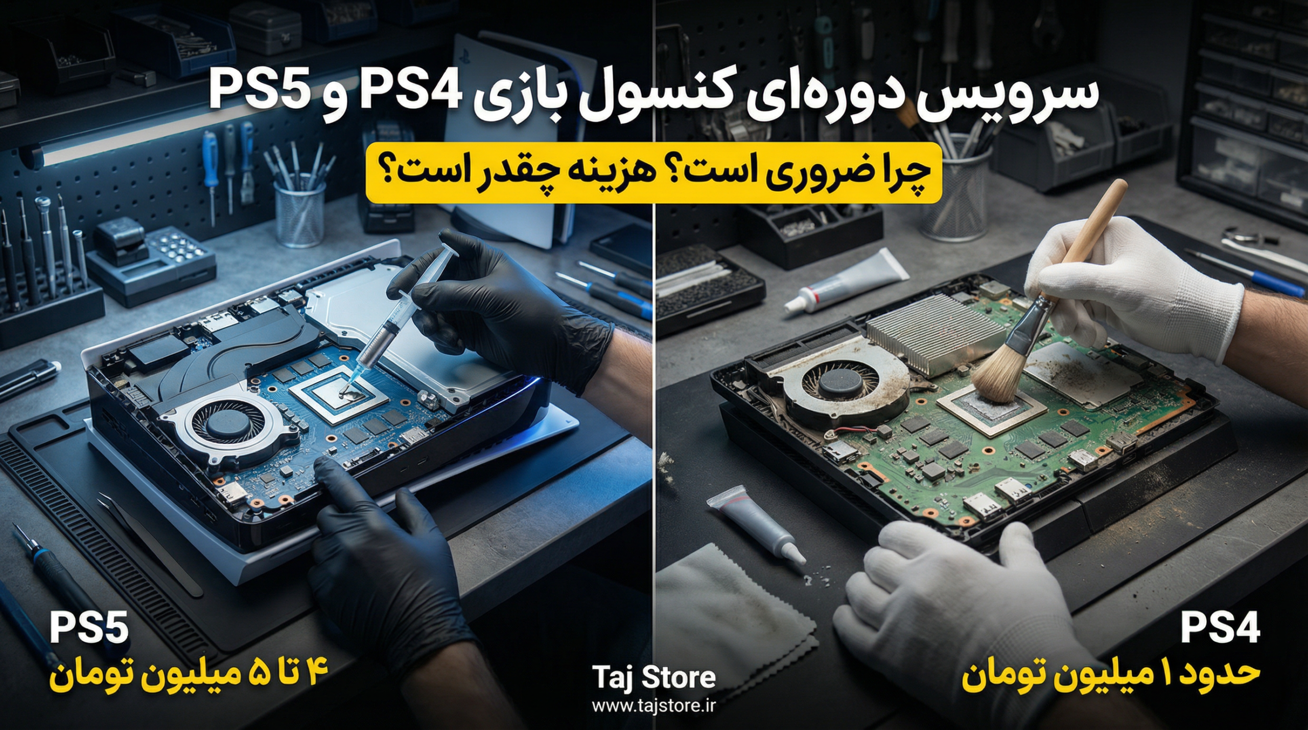 در این مقاله از Taj Store به بررسی کامل اهمیت سرویس دوره‌ای کنسول، زمان مناسب انجام آن و هزینه سرویس PS4 و PS5 می‌پردازیم.